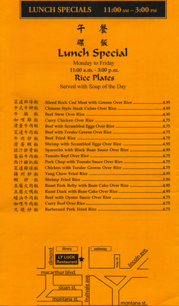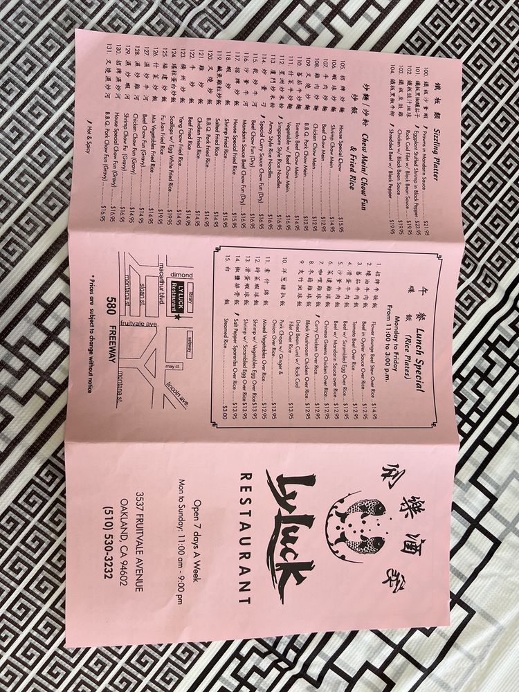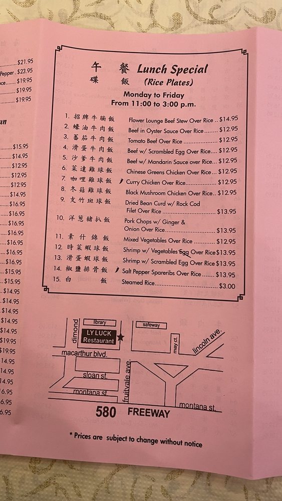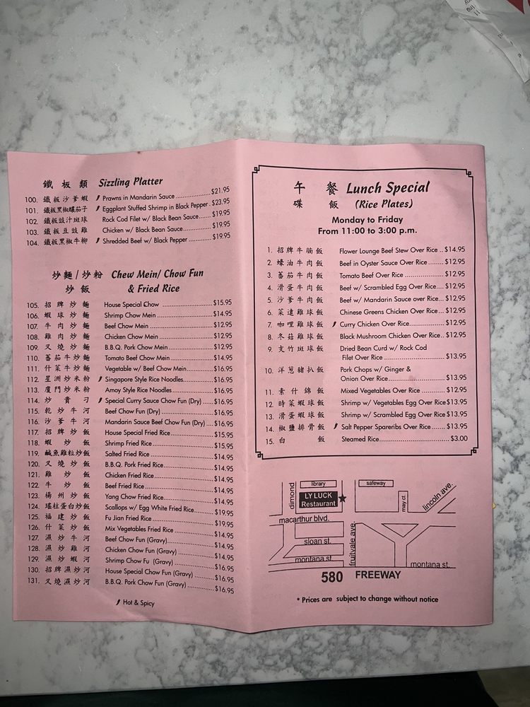 Welcome to Ly Luck Restaurant, a hidden gem in Oakland, CA, specializing in delicious Chinese cuisine. With a delightful menu that offers a variety of dishes, you'll find both traditional favorites and unique specialties. Highlights include the Black Bean Pepper Beef, a perfect blend of bite-sized beef, peppers, and onions, all expertly seasoned in rich black bean sauce. Another crowd-pleaser is the Salted Fish Chicken Fried Rice, known for its intense flavors and generous portions.